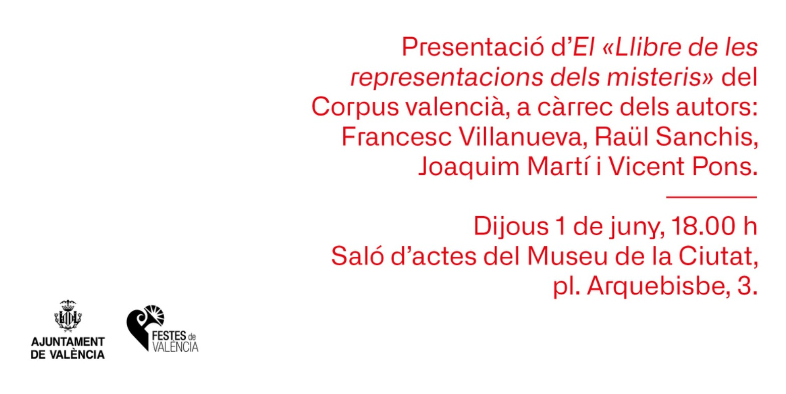19.00 h Charla «La música en torno al Corpus de Valencia», a cargo de Sergio Casanova, David Montoliu, Manuel Camarasa y Vicente Martinez Alpuente.